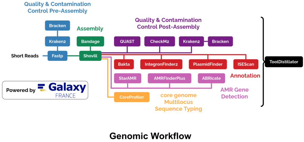 The ABRomics genomic workflow, powered by Galaxy France and launched from the ABRomics platform, is designed to process and analyze bacterial genomic data through a systematic approach. It is divided into six main steps, each ensuring robust and reliable results.